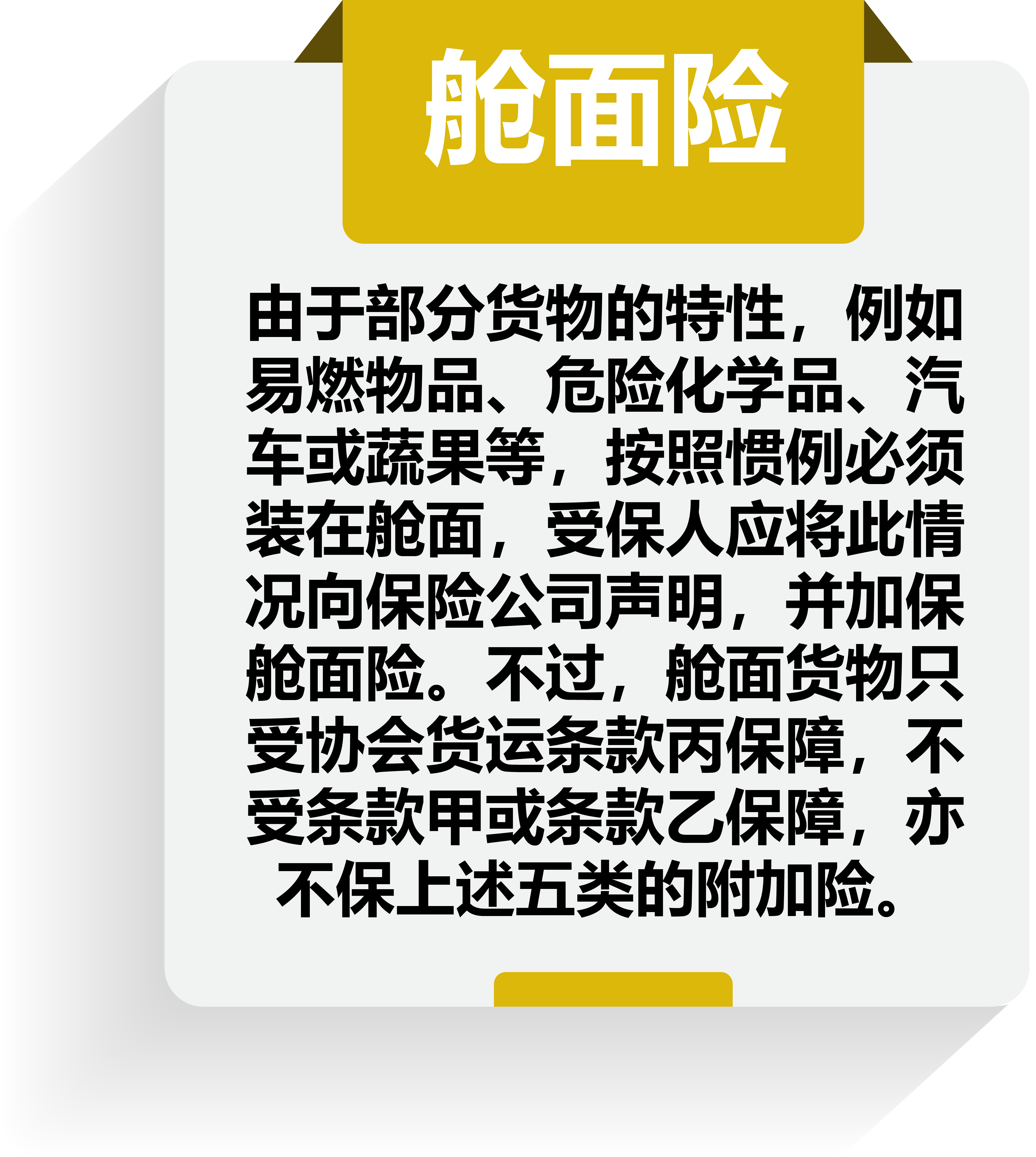 现时,运输保险通用的条款是协会货物保险条款,可分为甲、乙、丙三种,当中以甲条款之受保范围最为全面,依次递减,有关保障范围如下: